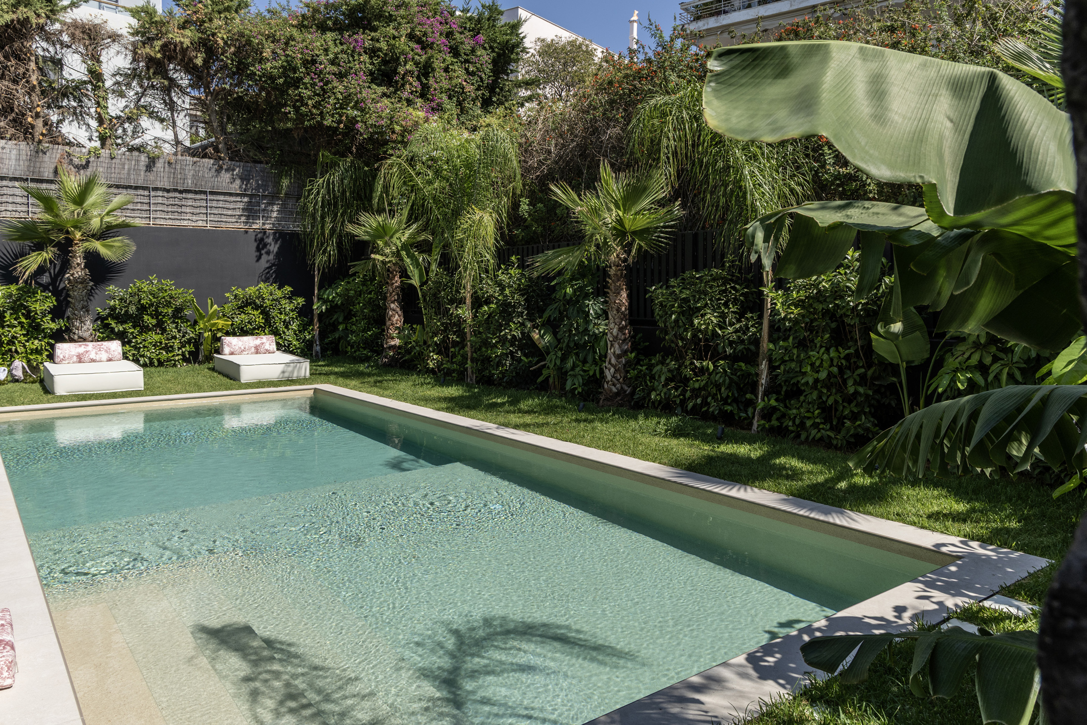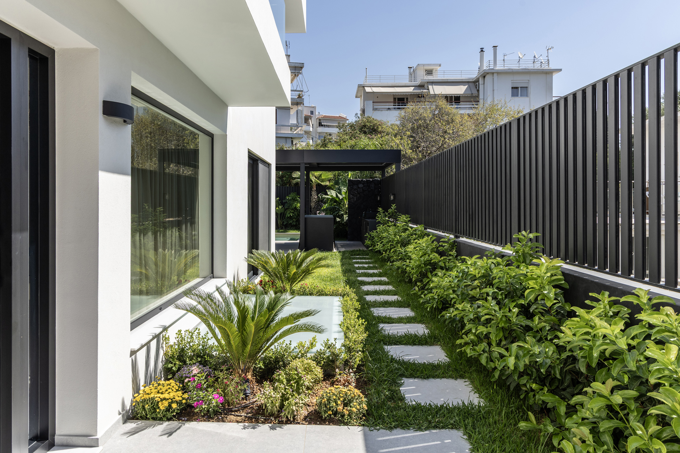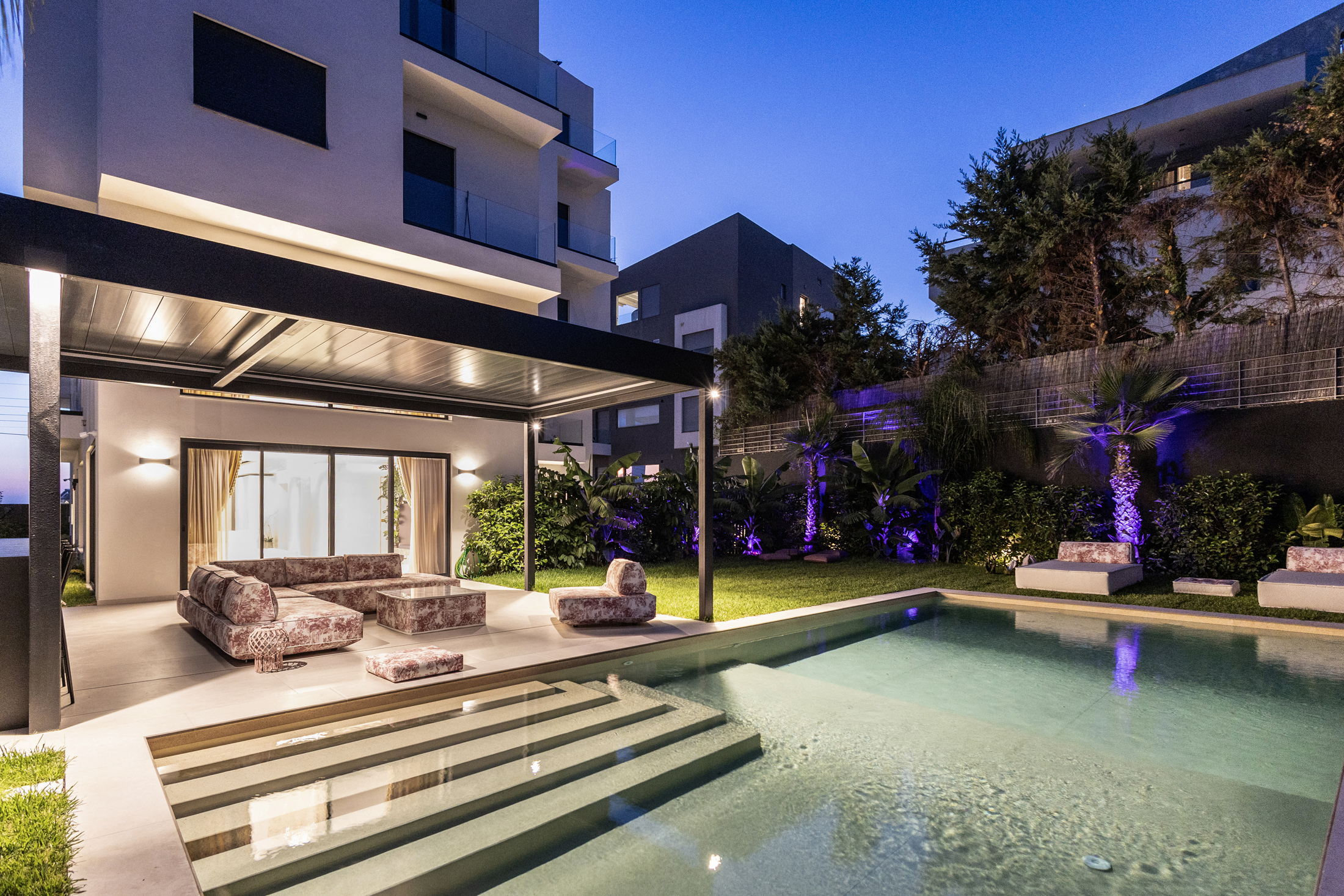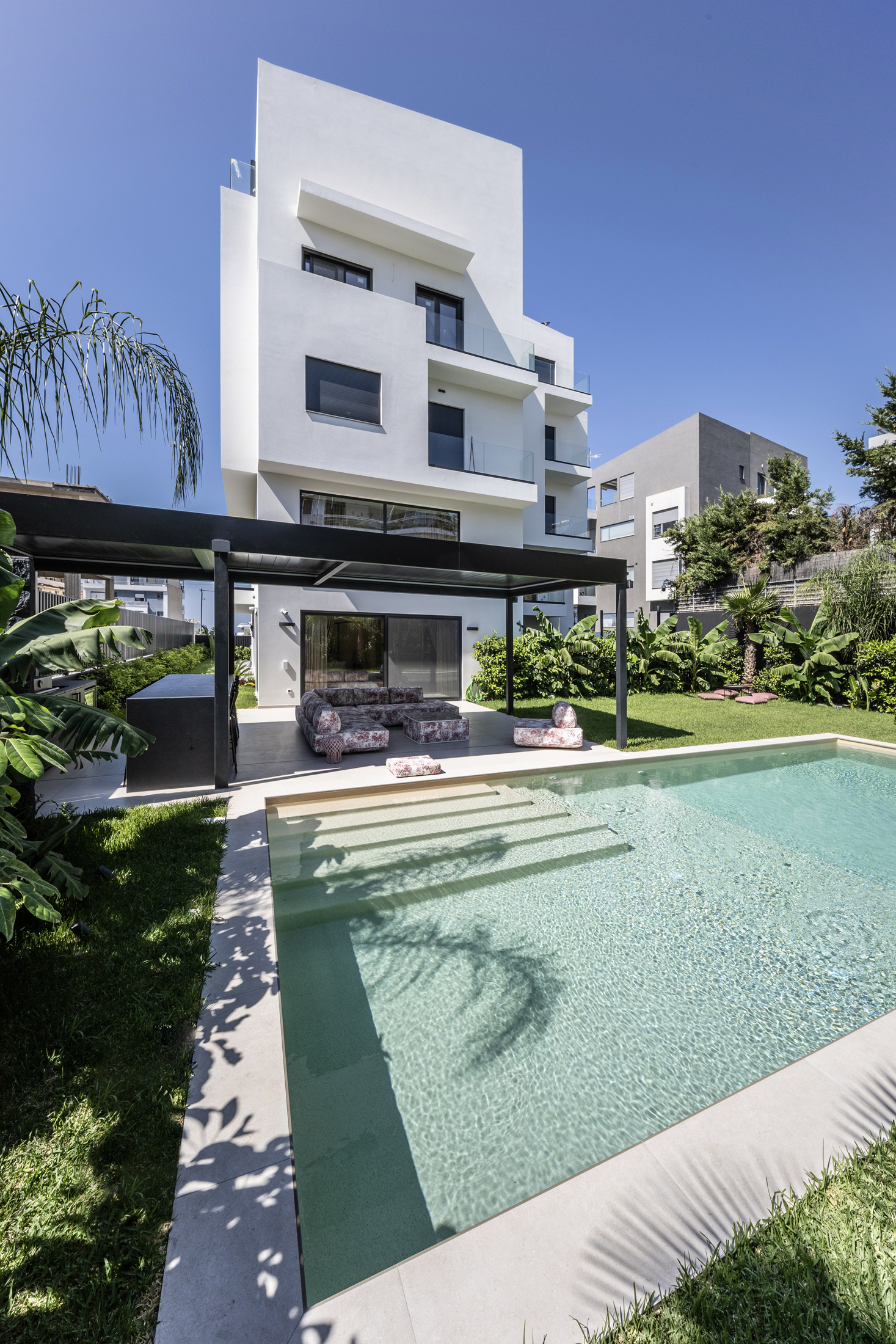 An additional feature integrated into the design is the water element both in private spaces in the form of a swimming pool or hot tub, and in public areas of the building with decorative waterfalls, as part of the design of the surrounding area, improving together with the green surfaces the living conditions in the building.